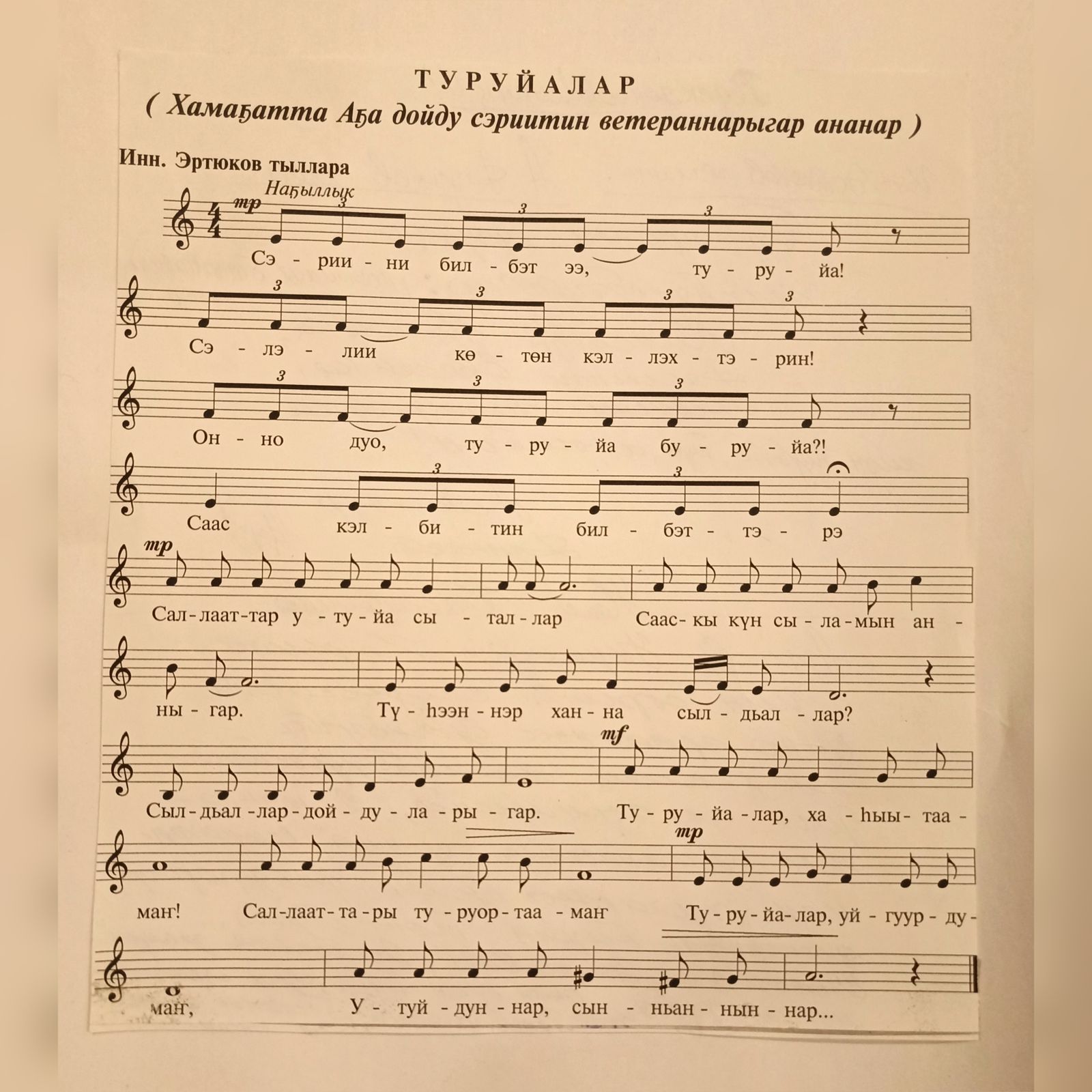 Аҕам барахсан! Эн көлүөнэҥ дьон бүгүн суохтар… Ол да буоллар, наада – “Туруйалар” диэн ырыабын анаан ыытабын! Тоҕото тугуй, диэҥҥэ этэбин: Бу — бэйиэт Иннокентий Эртюков тылларыгар 1941-1945 сс. Аҕа дойду Улуу сэриитин бэтэрээннэригэр, аҕам көлүөнэтигэр анаан ыыппыт ырыам, ону билиҥҥи Украинаҕа буола турар анал байыаннай эпэрээссийэҕэ сылдьар бары саха ыччатыгар аныыбын… Инникини алгыы, кыайыыны билгэлии, дьолу тускулуу!