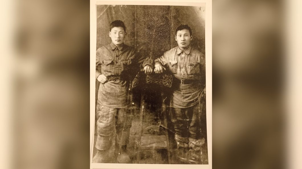 Хаартыскаҕа: Гвардеец Г.И.Дунаев (уҥата) сэрииттэн төннөн иһэн, аргыһынаан Амма уола Е.С.Егоровтыын. 09.03.1944 с.