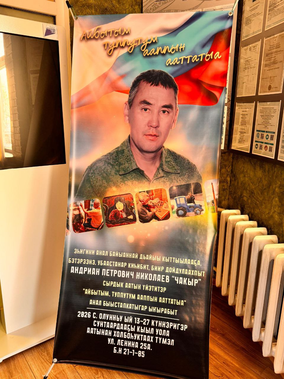 Кини аатын үйэтитэр сыалтан кэргэнэ Сардаана Алексеевна, аймахтара уонна нэһилиэк дьоно көмөлөөн, бу быыстапканы тэрийдилэр. Худуоһунньук уран көрүүтүнэн айыллыбыт хартыыналар бэрт сиэдэрэйдэр, ону тэҥэ киһи эрэ кэрэхсиир оҥоһуктары тутан таһаарбыт мындыр уус, билигин биһиги аттыбытыгар суоҕа хомолтолоох… Анал байыаннай дьайыыга сулууспалыы сылдьан бүтэһиктээҕин уруһуйдаабыт сардаана сибэккитэ кини кэргэнигэр истиҥ тапталын, дириҥ убаастабылын көрдөрөр. Маннык үйэтитиигэ үлэлии сылдьар кэргэн, элбэх оҕолоох ийэ Сардаана Алексеевнаҕа улуус баһылыга Анатолий Григорьев кутурҕанын тириэртэ, махтал суругу туттарда.