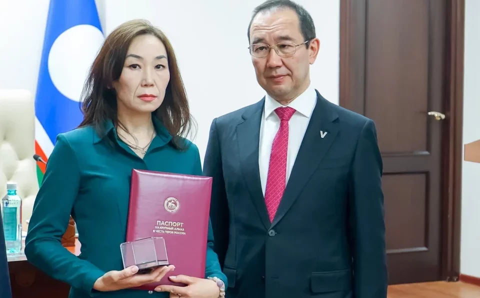 СӨ Ил Дархана Айсен Николаев Арассыыйа Дьоруойа Дмитрий Николаевич Егоров огдооботугар Надежда Алексеевна Андрееваҕа, байыаннай дьайыы кэмигэр дьоруойдуу олоҕун толук уурбут байыас чиэһигэр 24,82 караттаах ыйааһыннаах алмаас пааспарын уонна куопуйатын туттарда.