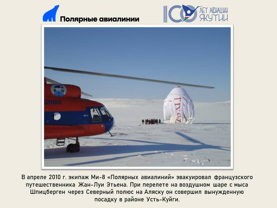 2010 сыллаахха муус устарга Франция айанньыта Жан-Луи-Этьен салгын саарынан Аляскаҕа айаннаан иһэн, Усть-Куйгаҕа түһэргэ күһэллибитэ. Кини салгын саарынан Шпицберген тумуһуттан…