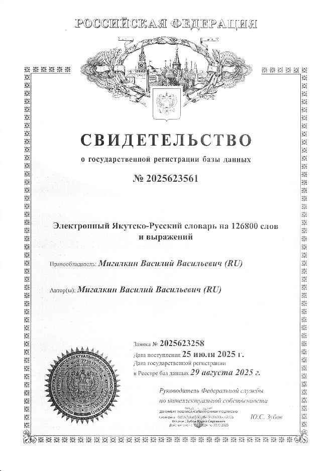 Таҥара куруук өйдөтөр, маннык суруй диэн этэр, санаабар, кини аттыбар баар курдук. Арассыыйа интеллектуальнай бас билиитин быһаарар уонна регистрациялыыр Федеральнай сулууспата судаарыстыбаннай эспэртиисэ түмүгүнэн сибидиэтэлистибэ биэрдэ.