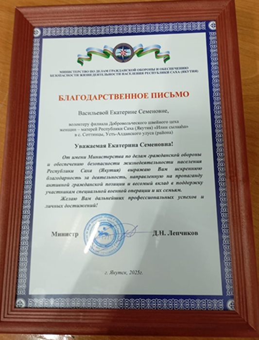 Екатерина Семеновна инникитин да бу хайысхаҕа салгыы үлэлэһэр санаалаах, илиитин иистэн араарбат. Кини иистэнньэҥнэр күрэстэригэр кыттан хаста да кыайыылааҕынан тахсыбыта. Байыаннай таҥаһы тигиигэ быйыл өрөспүүбүлүкэтээҕи күрэскэ Чурапчы улууһун хамаандатыгар киирсэн иккис бириистээх миэстэни ылбыттара.