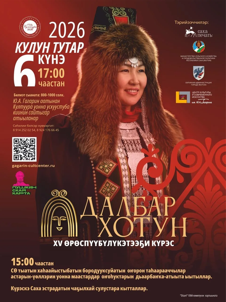 Сандал сааһы көрсө эһигини кулун тутар 6 күнүгэр 17 чаастан Ю.А.Гагарин аатынан Култуура уонна ускуустуба киинигэр саха дьахтарын мындыр өйүн, хоһуун үлэтин, үтүө санаатын, мааны майгытын арыйар “ДАЛБАР ХОТУН-2026” күрэс дьоллоох, дьоһун түһүлгэтэ долгуйа күүтэр!
