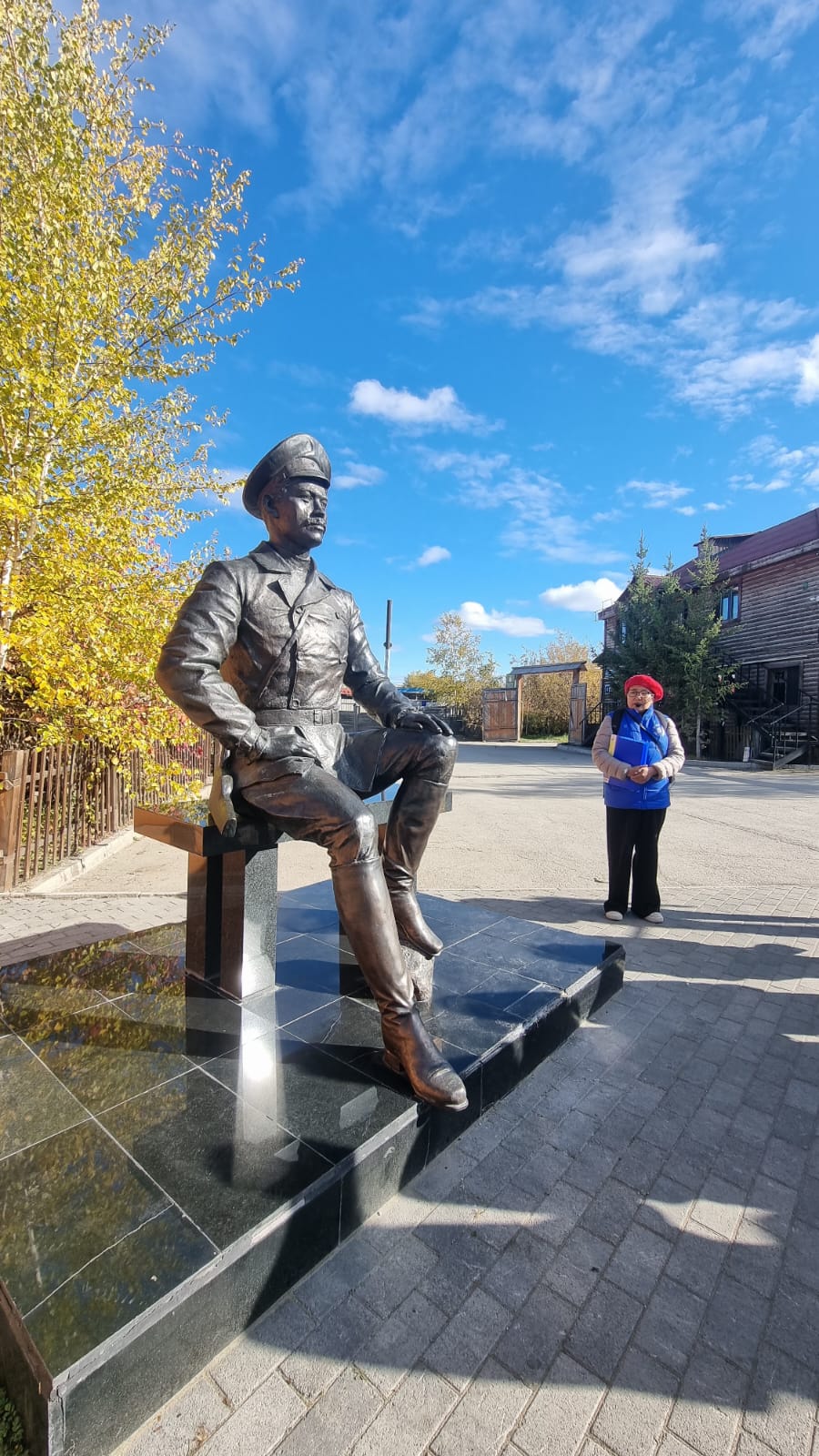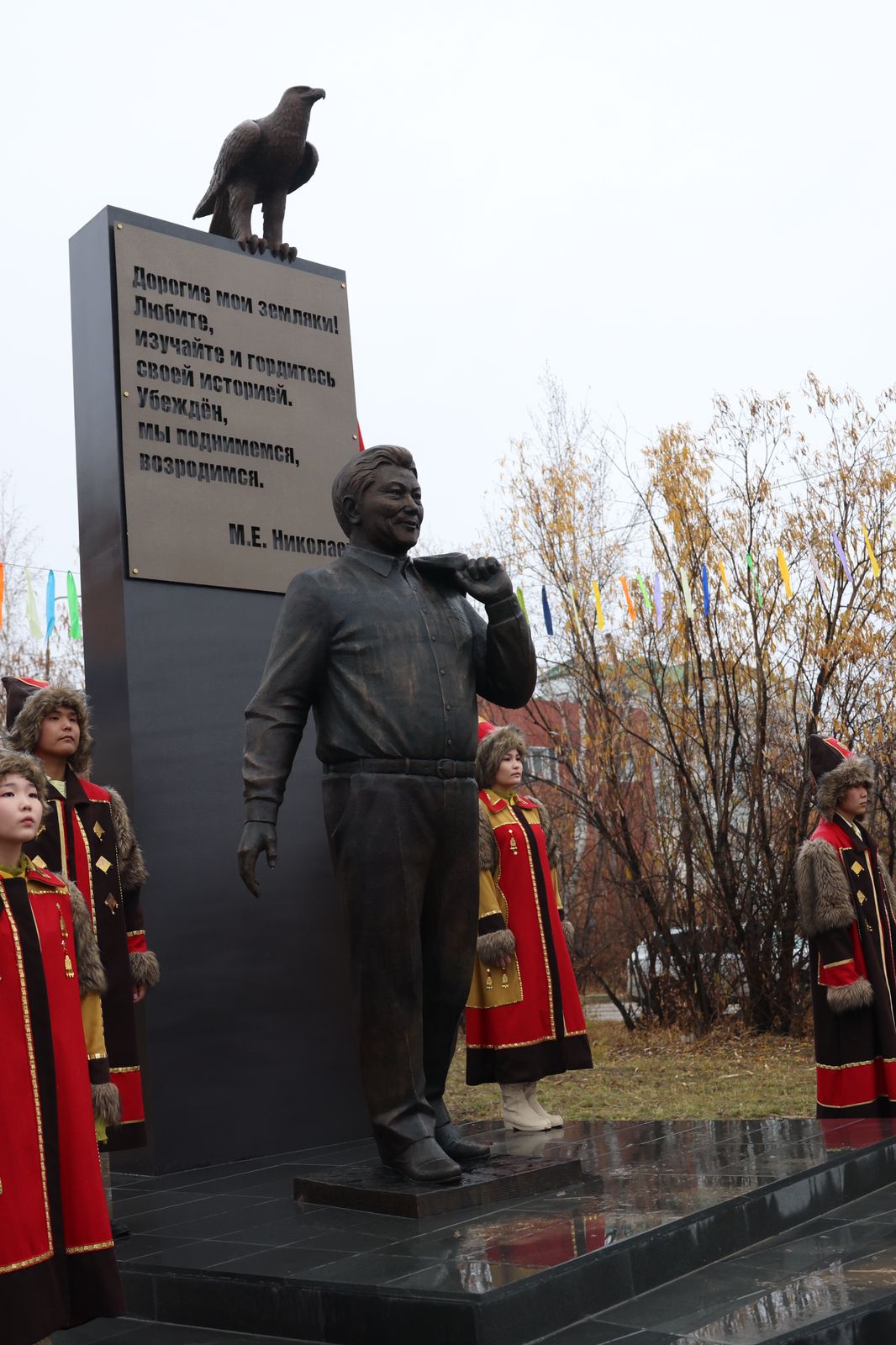 Боруонсаттан кутуллубут мэҥэ тааска кини бэйэтинэн илэ чахчы күлэн мүчүйэн турар курдук, үрдүгэр хаҥаластар ытык көтөрдөрө — өксөкү кыыл олорор, кэннигэр тапталлаах норуотугар анаабыт кэс тыла суруллубут: «Дорогие мои земляки! Любите, изучайте и гордитесь своей историей. Убеждён, мы поднимемся, возродимся!»