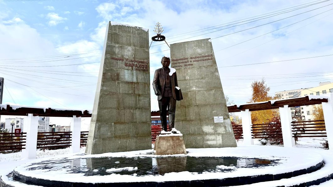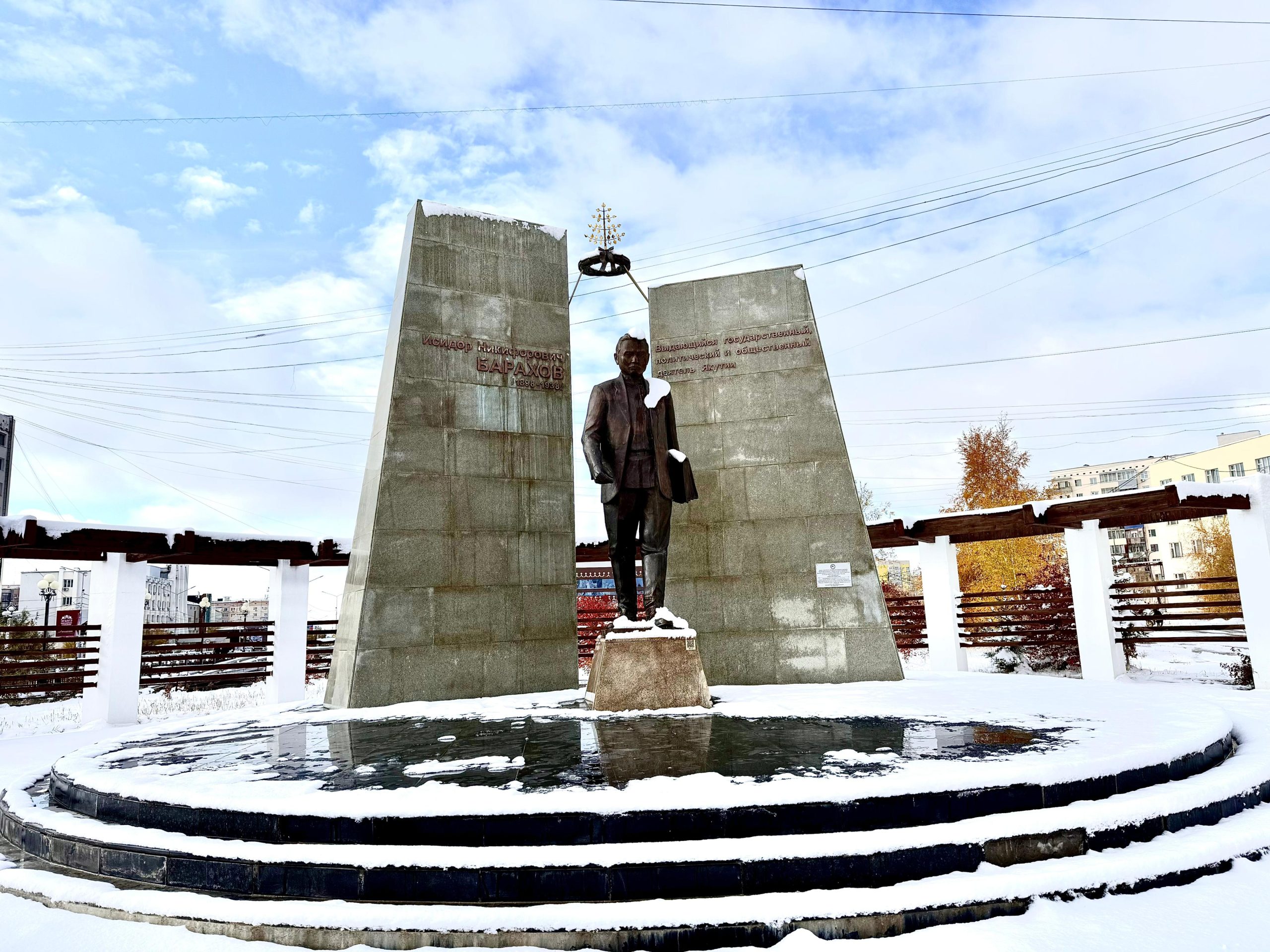 Өрөспүүбүлүкэ төрүттэнэригэр уһулуччулаах үтүөлээх Исидор Никифорович Бараховка анаммыт пааматынньык Дьокуускайга Киров уонна Поярков уулуссалар быһа охсуһууларыгар, 2014 сыллаахха турбута. Скульптор Семен Прокопьев бу бронзаттан оҥорбут пааматынньыгар бэлитиичэскэй диэйэтэл инникигэ хардыылаан эрэрин көрдөрүт. Кини кэннигэр 5 миэтэрэ үрдүктээх икки аҥаар трапеция курдук тутуулар бааллар. Пааматынньык уопсай үрдүгэ 5.5 миэтэрэ.