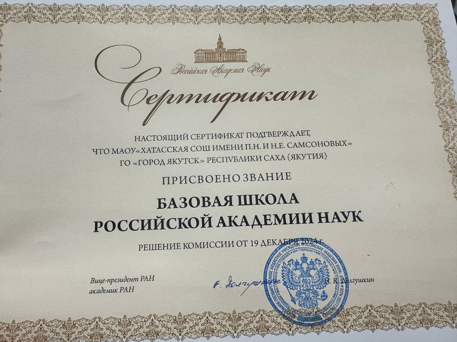 П.Н. уонна Н.Е.Самсоновтар ааттарынан Хатас орто оскуолата “Арассыыйатааҕы Билим академиятын тирэх оскуолата” бырайыакка киирбит уонна туһааннаах сэртипикээти туппут.
