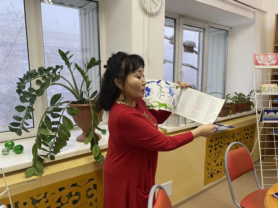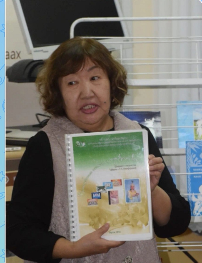 — Бу күннэргэ бибилэтиэкэ күндү ыалдьытынан СӨ култууратын үтүөлээх үлэһитэ, уйулҕаһыт, алгысчыт, бибилэтиэкэр идэлээх Тайаана Никифорова буолла. Кини айар үлэтин түмүгүн – кинигэлэрин билиһиннэрдэ. Бастатан туран, Татьяна Афанасьевна кинигэлэриттэн чорботон төрөппүттэрин туһунан суруйбут ахтыытын сиһилии билиһиннэрдэ.