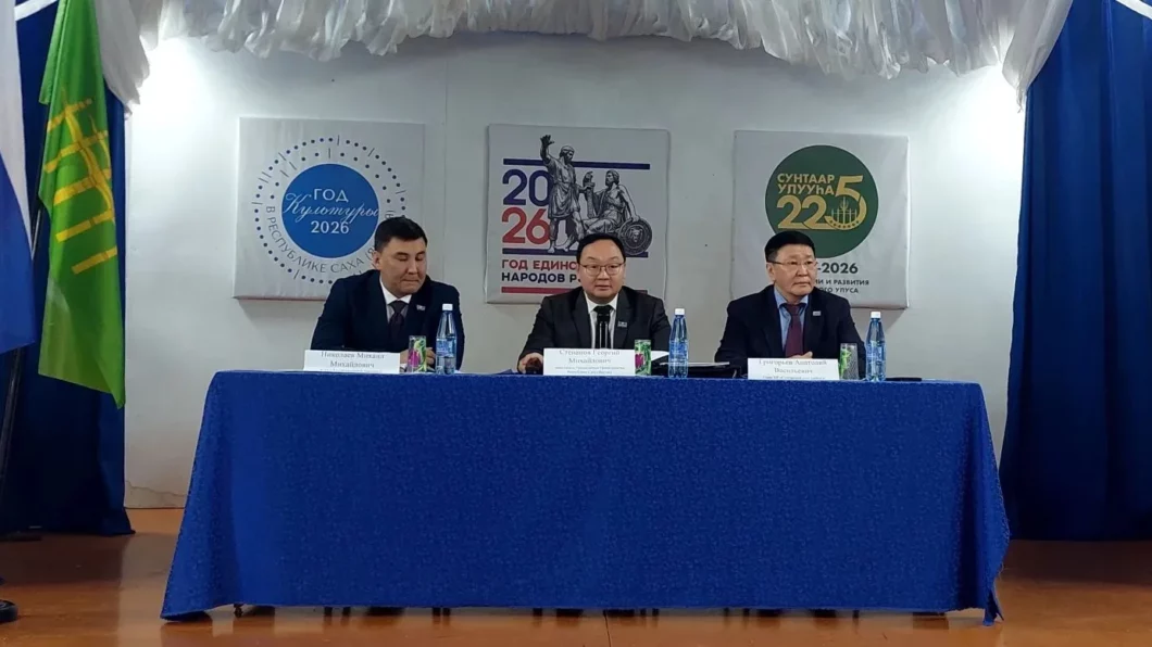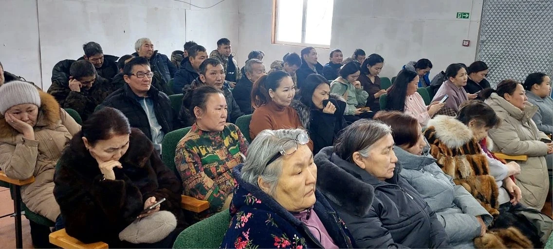СӨ бырабыыталыстыбатын бэрэссэдээтэлин солбуйааччы Георгий Степанов салайааччылаах отчуоттуур бөлөх Туойдаах нэһилиэгин олохтоохторун иннигэр ааспыт сыллааҕы үлэ түмүгүнэн отчуоту туруорар.