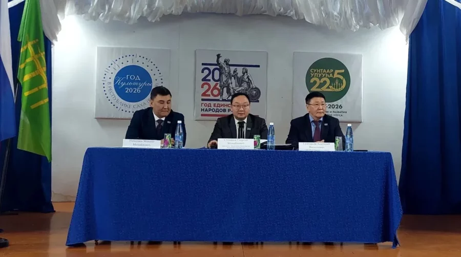 СӨ бырабыыталыстыбатын бэрэссэдээтэлин солбуйааччы Георгий Степанов салайааччылаах отчуоттуур бөлөх Туойдаах нэһилиэгин олохтоохторун иннигэр ааспыт сыллааҕы үлэ түмүгүнэн отчуоту туруорар.