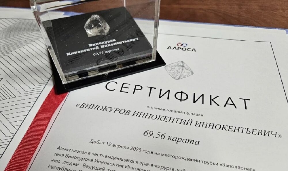 2025 сыллаахха АЛРОСА хампаанньа муус устар 12 күнүгэр “Заполярная” туруупкатыттан көстүбүт 69,56 караат ыйааһыннаах улахан алмааска уһулуччулаах быраас, чинчийээччи-учуонай Иннокентий Винокуров аатын иҥэрбитэ.